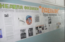 Неделе физики был посвящён стенд на втором этаже. Стенд поместил в себя разделы «Первый пилотируемый», в котором изложены все подробности из биографии звёздного человека Советского Союза, о его наградах, семье, происхождении. Раздел «Первый полёт», в котором описывался сам полёт, подготовка к нему и последствия. В разделе «Вы спрашивали…» были помещены ответы на интересующие учащихся вопросы. И самая любимая часть стенда - раздел «Физика и творчество», в нём помещены наилучшие творческие работы учащихся начальных и средних классов. Это рисунки учащегося 1А класса Султангали Аксёнова «Игрушка нового века» и «Встреча в космосе», также Елены Моисеевой «Чернушка в космосе» (классный руководитель Малина Замиловна Гилязова), из 1Б класса – Альфии Рамазановой «Изучаем космонавтику» (классный руководитель Роза Ульфатовна Власова), из 3А класса Илюзы Гараевой «Наша гордость – первый человек в космосе», Ислама Хадеева «Гордость СССР – первый человек в космосе», Аяза Закиева «Межпланетная экология» (классный руководитель этих ребят Разина Хасановна Алимова), из 3Б класса – Алмаза Мурасова «Практическое занятие по астрономии», а рисунок ученика того же 3Б класса Валера Нерсисян «Сегодня «Природа», а завтра – «Физика»» занял первое место (классный руководитель Наиля Хазиахметовна Бикмухаметова). Среди учащихся 8-х классов отличились фотоколлаж «Звёздная профессия» ученика 8Б класса Рифата Искандарова, и графический рисунок «Космос через телескоп» ученика 8А класса Равиля Юсупова.