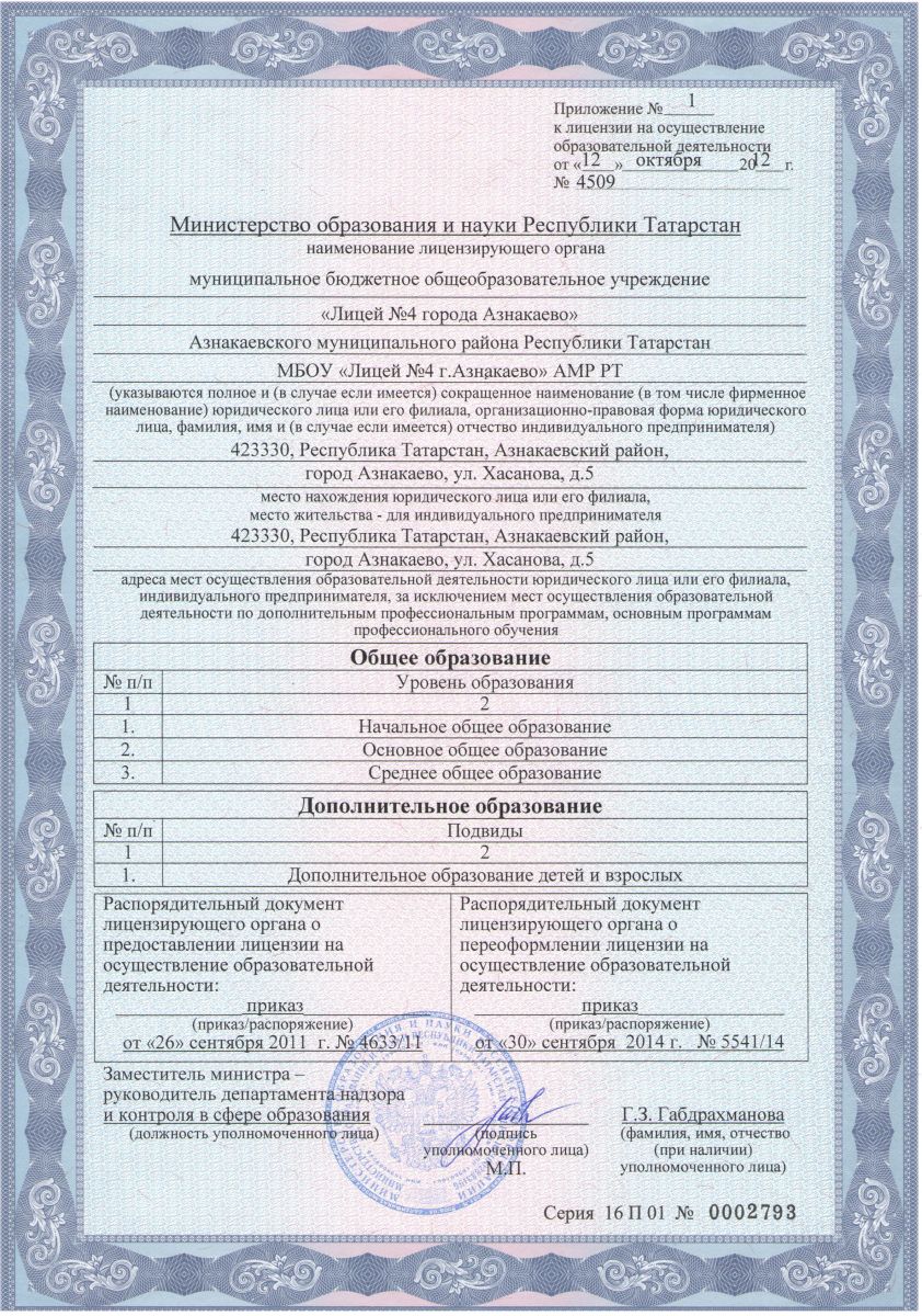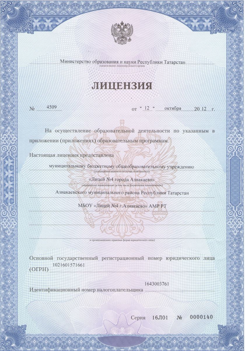 Муниципальное бюджетное общеобразовательное учреждение «Лицей №4 города Азнакаево» Азнакаевского муниципального района Республики Татарстан/ Татарстан Республикасы Азнакай муниципаль районы муниципаль бюджет гомуми белем учреждениесе “Азнакай шәһәре 4нче лицее”