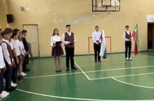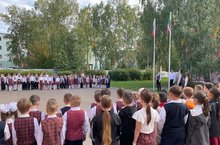 Право поднять государственный флаг России и Республики Татарстан доверили ученикам 9 класса. Иртәнге линейка Рәсәйнең һәм Татарстанның флагларын күтәрү һәм гимннарын башкару тантанасы белән ачылып китте. -