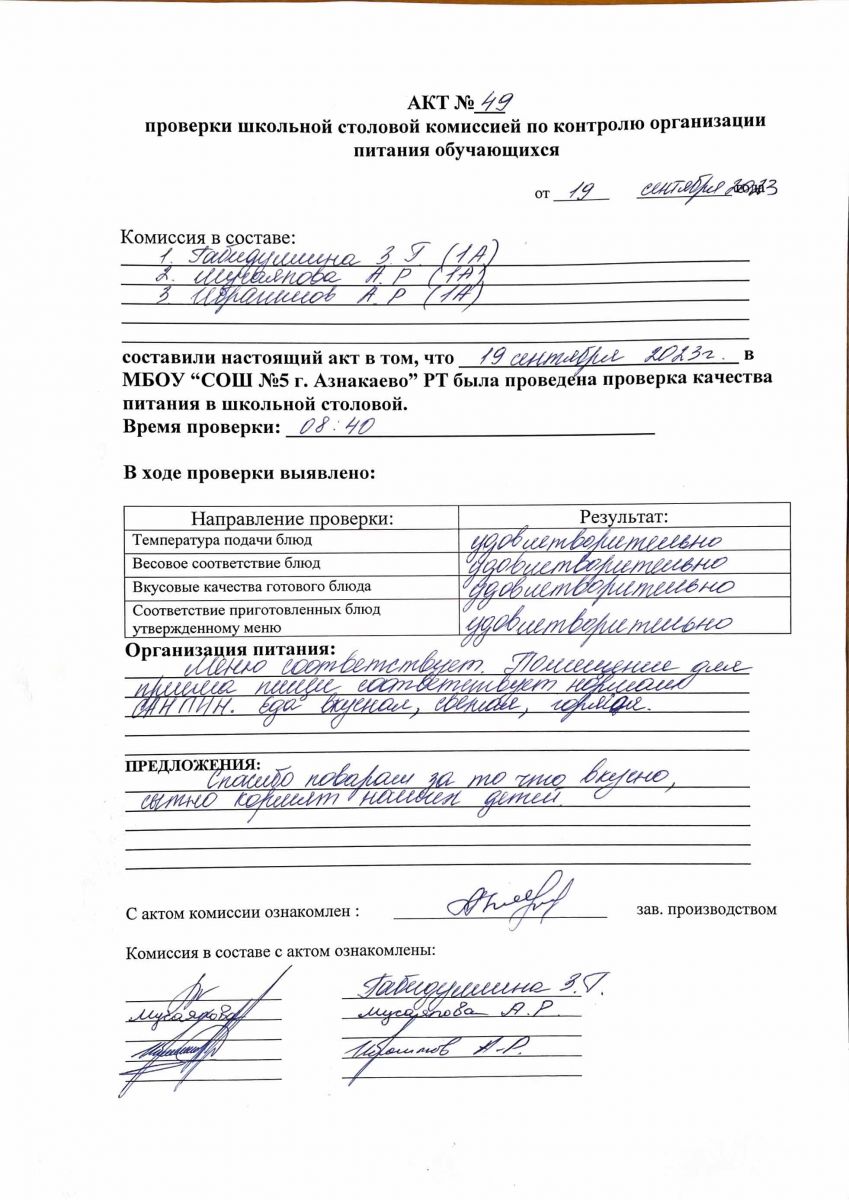 Акт проверки школьной столовой от 19.09.2023 г. (фото1, фото2, фото3)