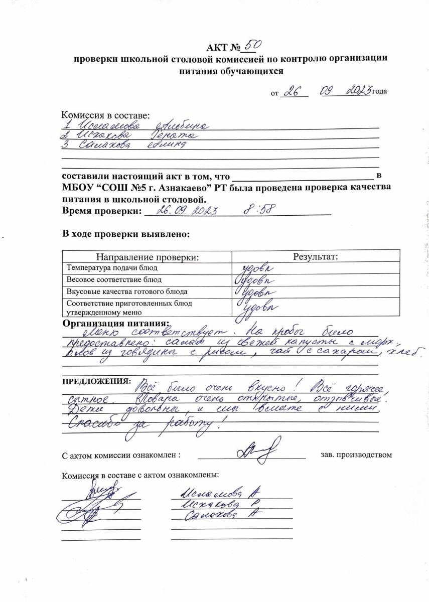 Акт проверки школьной столовой от 26.09.2023 г. (фото1, фото2, фото3)