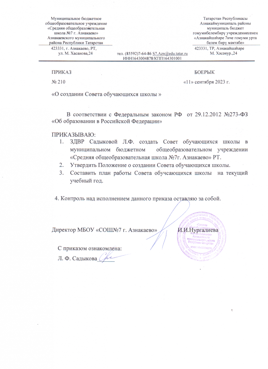 Приказ о создании Совета обучающихся школы