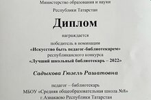Садыкова Гюзель Рашатовна стала победителем республиканского конкурса «Лучший школьный библиотекарь -2022» в номинации «Искусство быть педагог-библиотекарем». Поздравляем,дальнейших успехов!????????