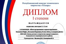 Учащиеся Ахмадиев Данил и Гатин Айзат были награждены дипломом I степени в номинации "Конструирование и проектирование" в Республиканском конкурсе технического творчества "Технарь"
