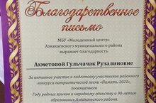 Учитель русского языка и литературы Ахметова Гульчачак Рузалиновна награждена Благодарственным письмом МБУ "Молодёжный центр" за активное участие и подготовку участников районного конкурса патриотической песни " Память". Поздравляем!