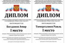 Учащийся 7а Богданов А. и учащийся 8б Тимергалиев Р. заняли 1 место на Всероссийском конкурсе начального технического моделирования и конструирования «Юный техник-моделист» в номинации «Робототехника и интеллектуальные системы».