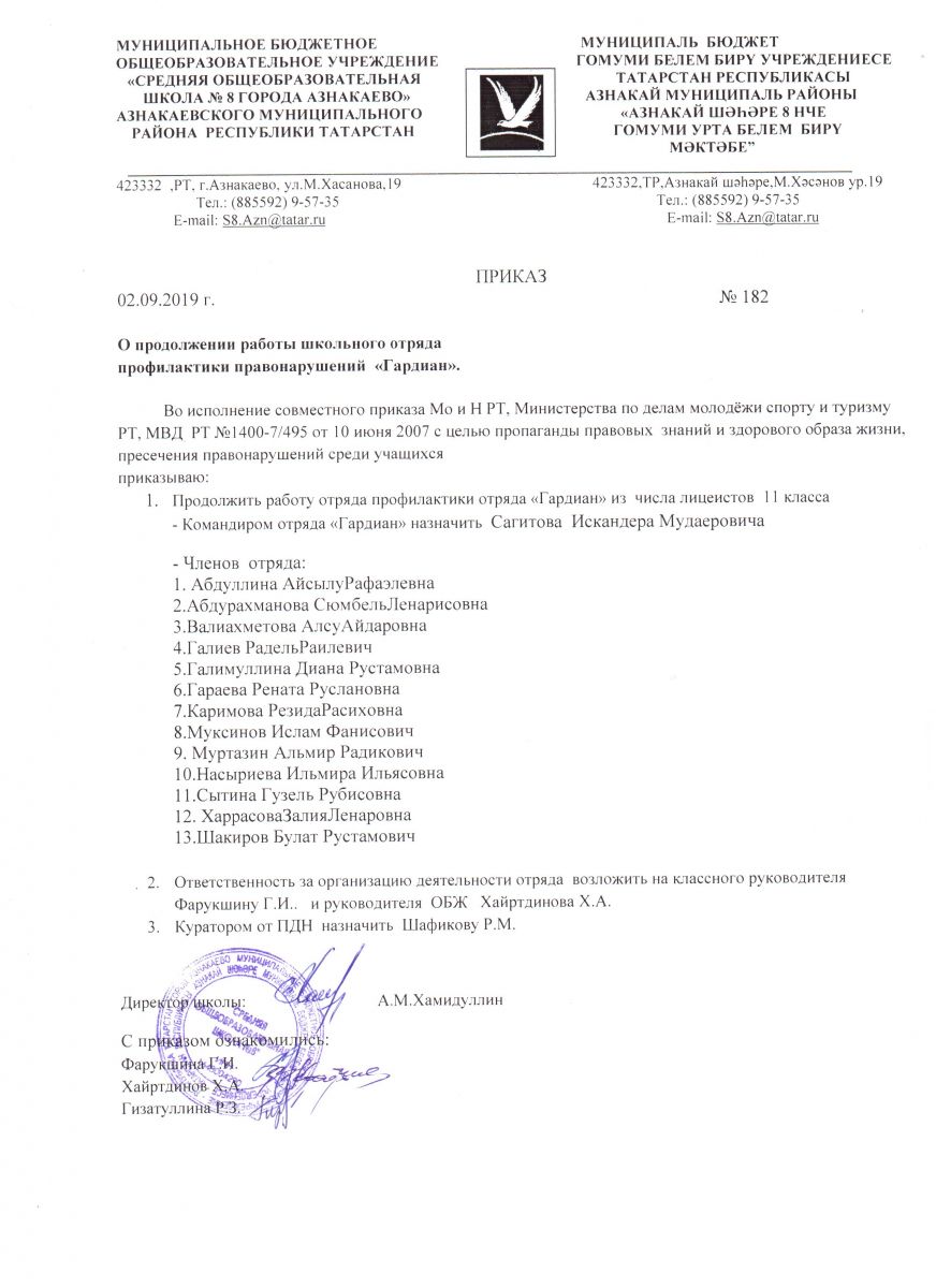 Приказ "О продолжении работы школьного отряда профилактики правонарушений "Гардиан"