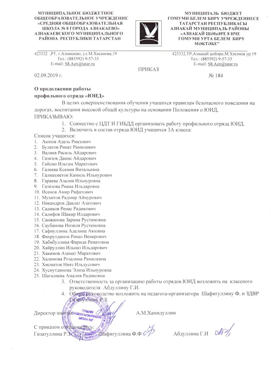 Приказ "О продолжении работы профильного отряда ЮИД"