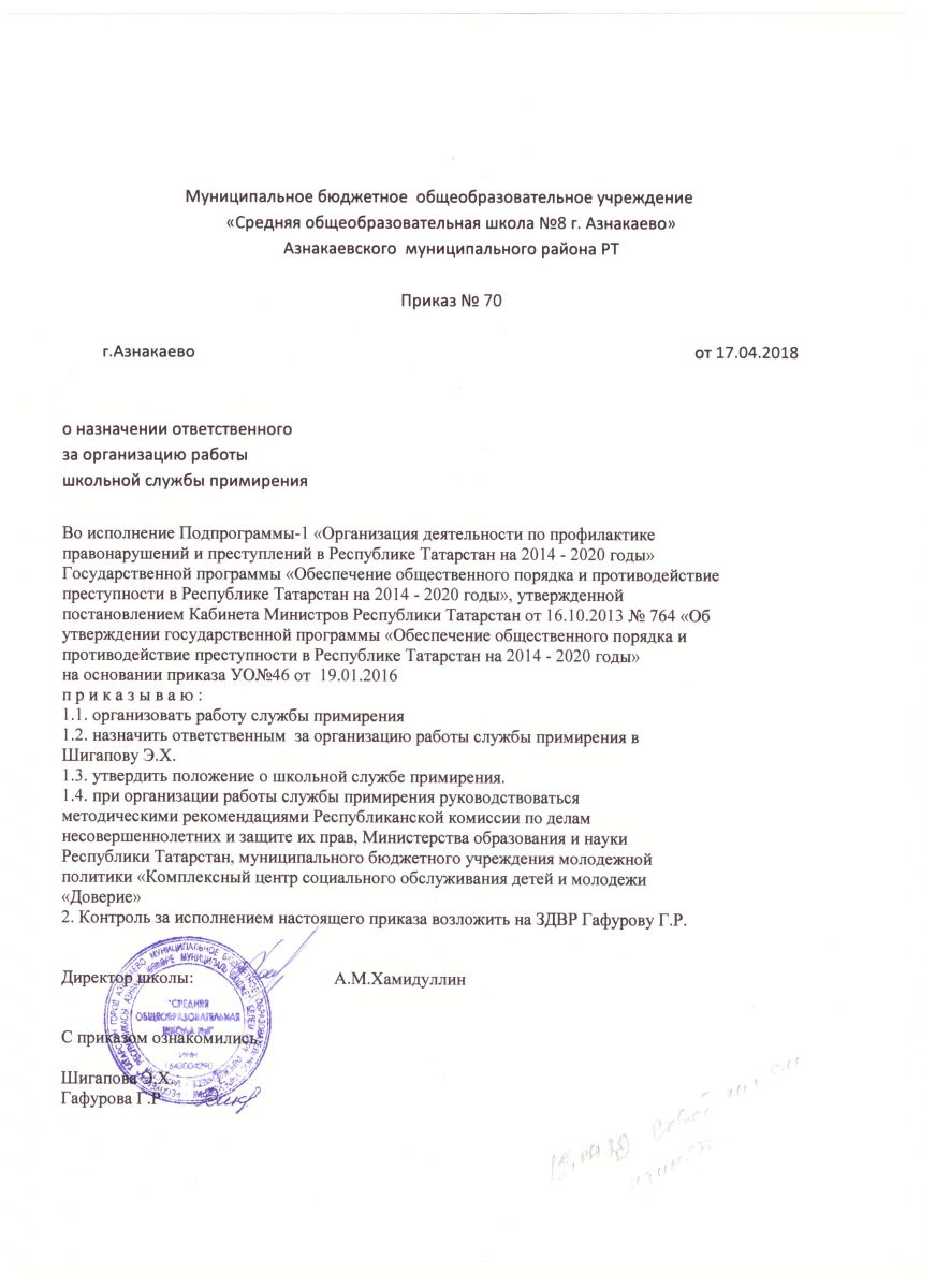 Приказ о назначении ответственного за организацию работы школьной службы примерения
