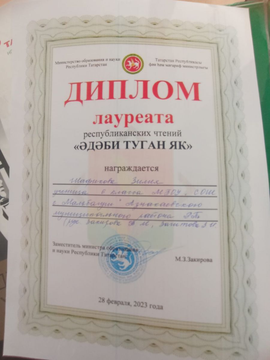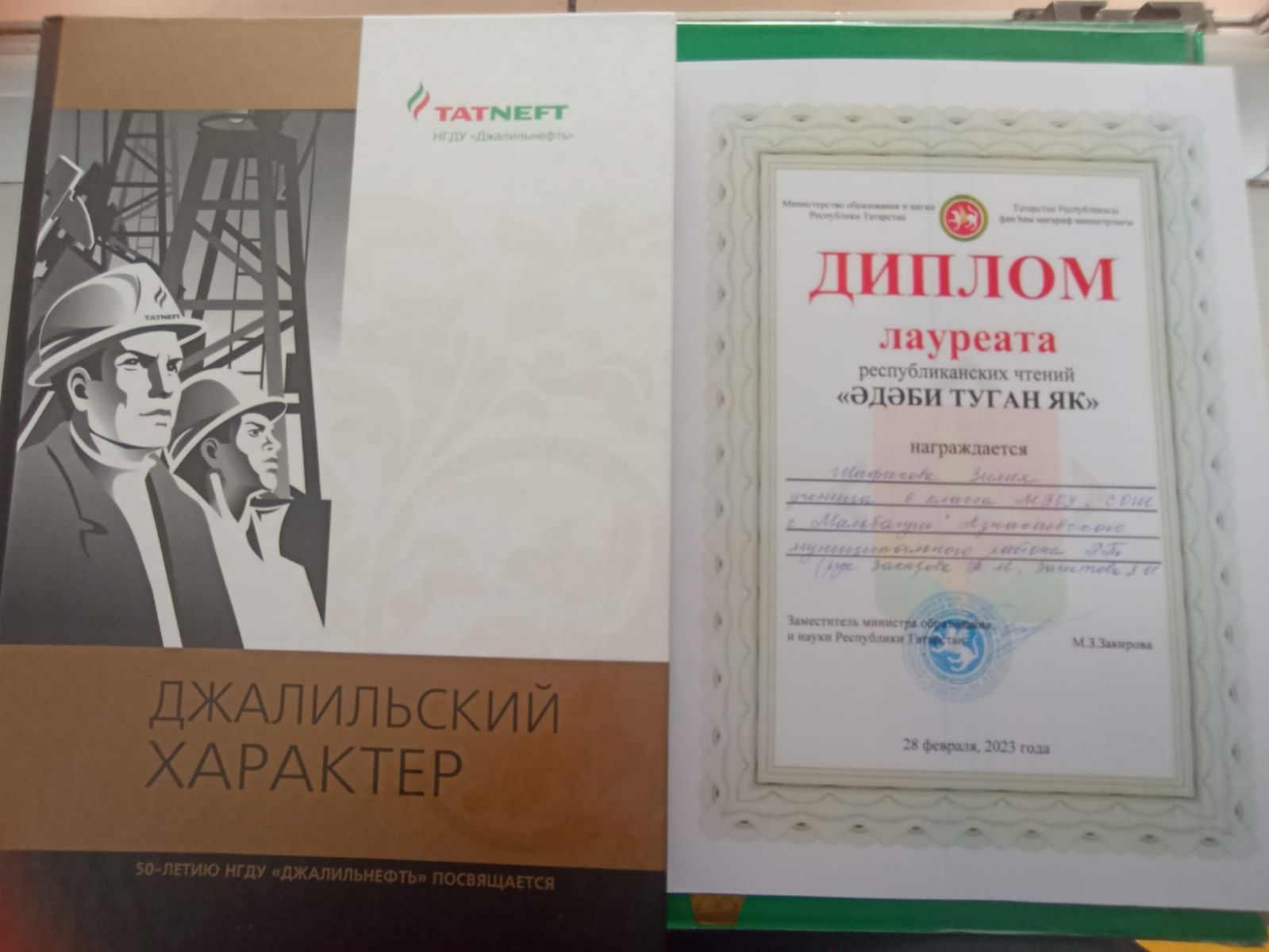 В МБОУ «Джалильская средняя общеобразовательная школа №2» прошел заключительный (очный) этап республиканских чтений «Әдәби туган як». Шафикова Зилия ученица 6 класса стала лауреатом.