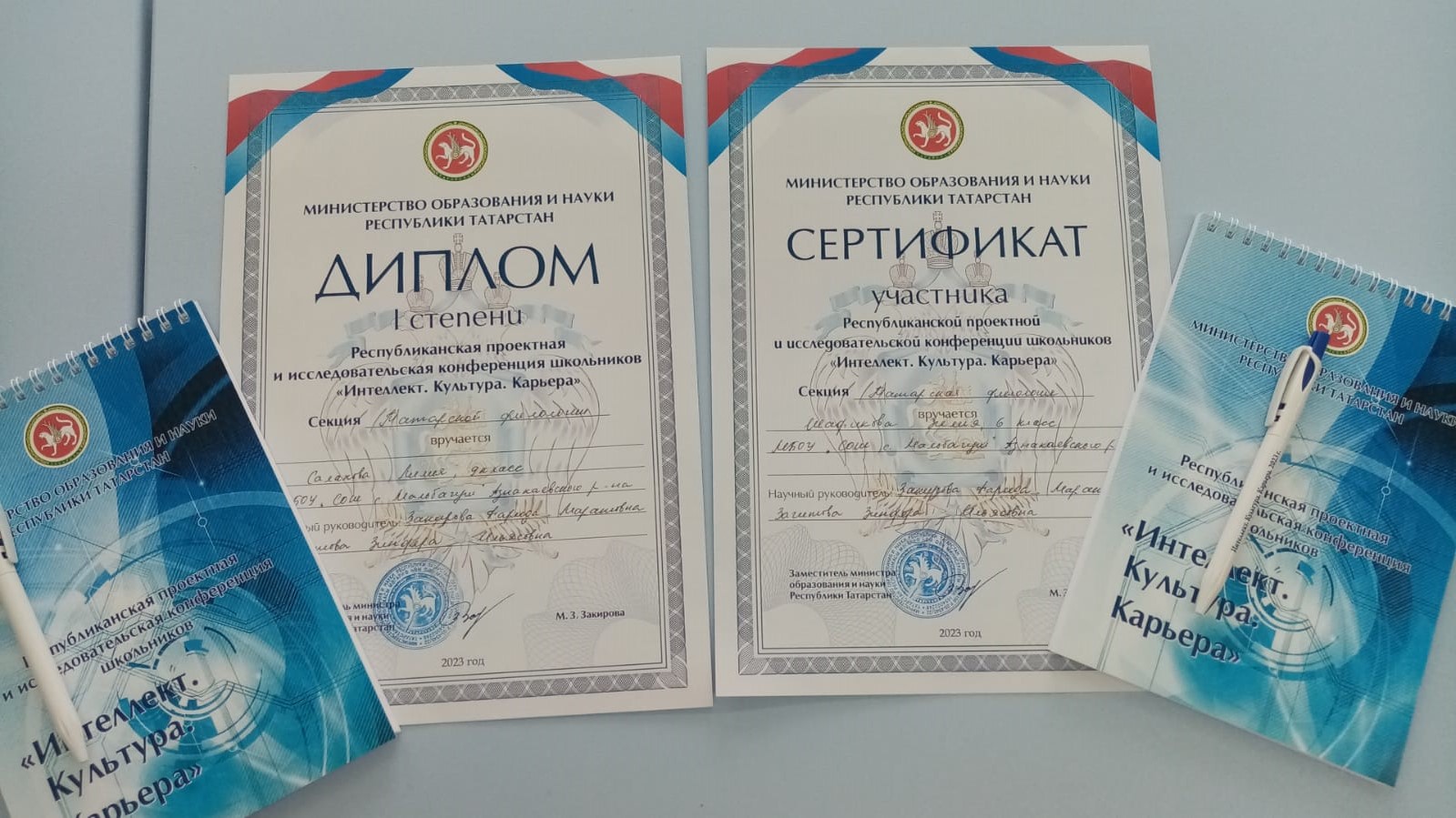 4 нче февральдә Казан шәһәренең Совет районы 90 нчы гимназия базасында мәктәп укучыларының «Интеллект. Мәдәният» дип исемләнгән проектларны яклау конференциясе булып узды. Аны Татарстан Республикасы Мәгариф һәм фән Министрлыгы оештырды. Конференциядә үз тикшеренүләре белән Сәлахова Лилия 9 нчы сыйныф укучысы һәм Шәфыйкова Зилә 6 нчы сыйныф укучысы - җитәкчеләр: Заһитова З.И., Закирова Ф. М. үзләренең эзләнү – тикшеренү эшләре белән чыгыш ясадылар. Жюри кызларның эзләнү – тикшеренү эшләрен югары бәяләде. Нәтиҗәдә: Сәлахова Лилия-I дәрәҗә Диплом. Җиңүләре белән котлыйбыз, кызларны!#ГодПедагогаНаставника