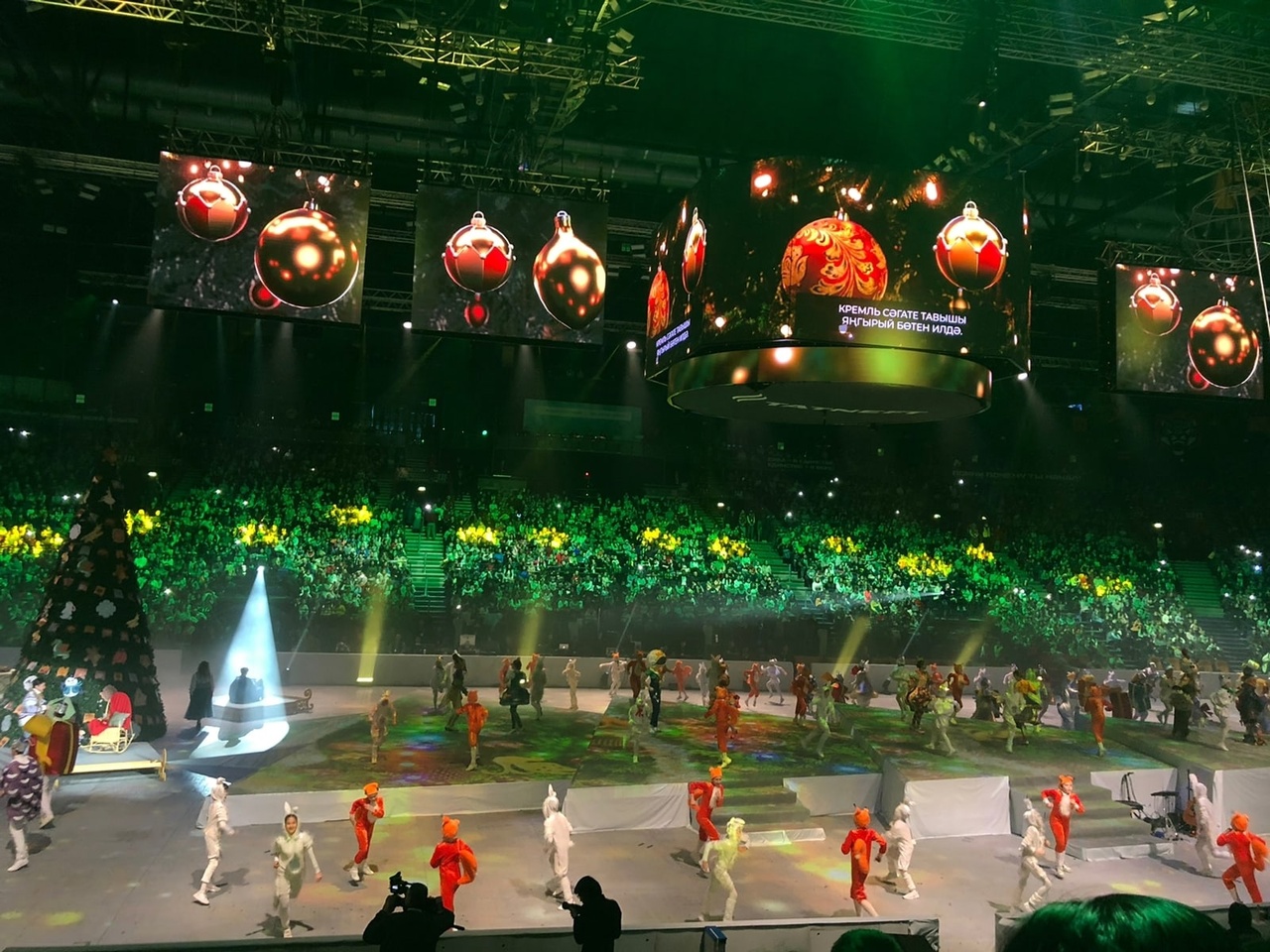 Главное представление для детей Татарстана. В Татнефть Арене прошла Республиканская Новогодняя Елка, которую по многолетней традиции открыл президент Рустам Минниханов . Главной темой постановки стали семейные ценности и их сохранение. Праздничную историю рассказали на двух языках – русском и татарском. Из нашей школы участвовала на Елке ученица 11 класса Ахметшина Раиля.