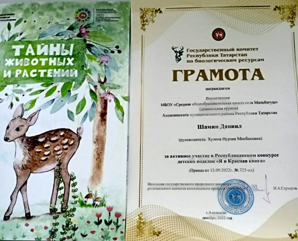 Муниципальный этап республиканского конкурса детских поделок «Я и Красная книга» проводился с 5 октября по 25 октября 2022 года. В конкурсе воспитанники детского сада с.Мальбагуш приняли активное участие. По итогам, представленным членами жюри, определились победители. Воспитатель Хузина Нурзия Мисбаховна награждена грамотой за подготовку участника для Республиканского конкурса детских поделок «Я и Красная книга».