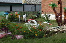 Воспитатели 4-х групп ДОУ приняли участие в конкурсе "Лучший дизайн участка". Они вырастили цветы, сделали поделки из вторичного сырья.В конкурсе победили совместный труд и дружба.
