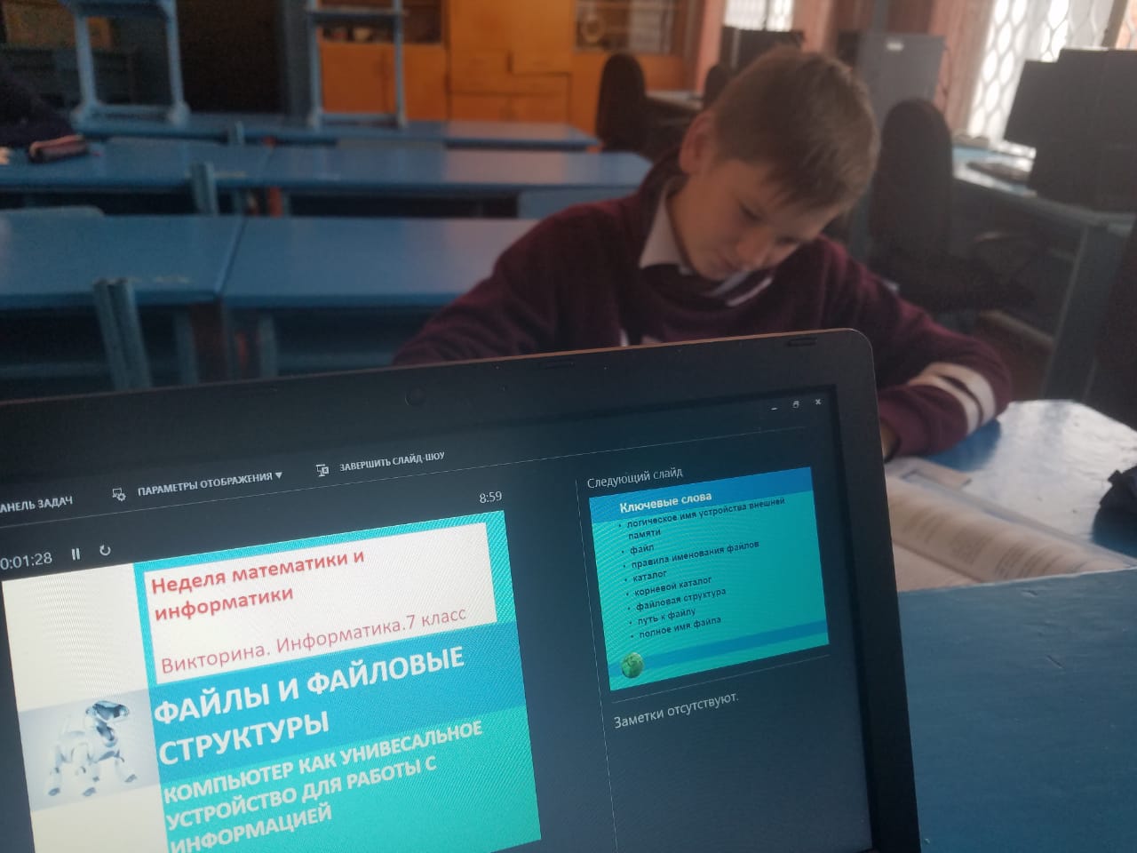 Сегодня в школе прошли мероприятия по предмету информатика под руководством учителя Регины Хуснутдиновой в рамках Недели математики и информатики. Ученик 8 класса создал проект на тему: «Графические информационные модели». Была представлена система школьного образования. Викторина на тему: «Файлы и файловая структура» организована в седьмом классе. Команды отвечали на вопросы, решали практические задачи, составляли и кодировали полный путь файлов. Дети из 9 класса прошли практикум в среде учебного исполнителя Кумир, учились программировать перемещения Робота. Ученики 10 класса приняли участие в вебинаре и обсудили вопросы на тему: «Современное программное обеспечение».