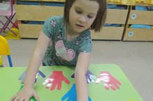 В дошкольной группе в режимных моментах проводятся индивидуальная работа. Например, здесь ребенок играет дидактическую игру "Учим цвета"./