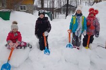 Дошкольники помогают чистить снег на игровой площадке/ Балалар уен мәйданчыгын кардан чистартырга булышалар.