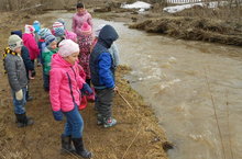 Көннәр җылы тору сәбәпле күп җирдә кар эреп бетте инде. Урман һәм болыннардан төшкән су белән елгалар ярларыннан тулыа акты. Бу матур күренеш бары тик апрельдә генә була. Бүген шул хозурлыкны карарга мәктәпкә хәзерлек һәм зурлар төркемендә тәрбияләнүче балалар экскурсиягә чыктылар.