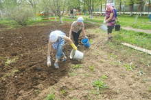 Бакчыбызда язгы эшләр гөрләп бара. Бүген территориядәге бакчага бәрәңге утырттык.