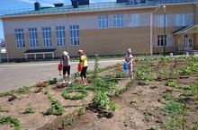 Бакчада эшләрне җиденче сыйныфлардан алтынчы сыйныфлар кабул итеп алдылар. Кызлар мәктәп тирәсен чәчәкләр белән матурлыйлар.