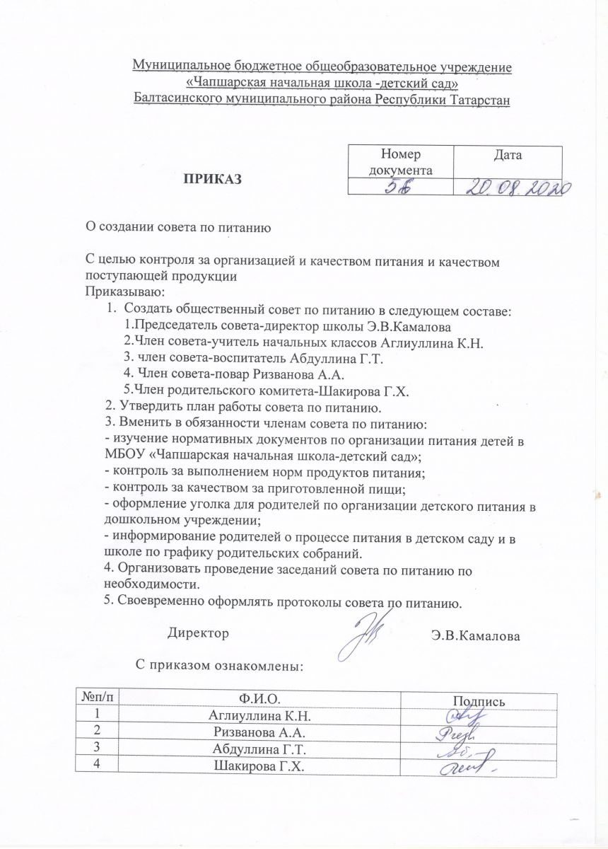 Приказ об организации и создании совета питания