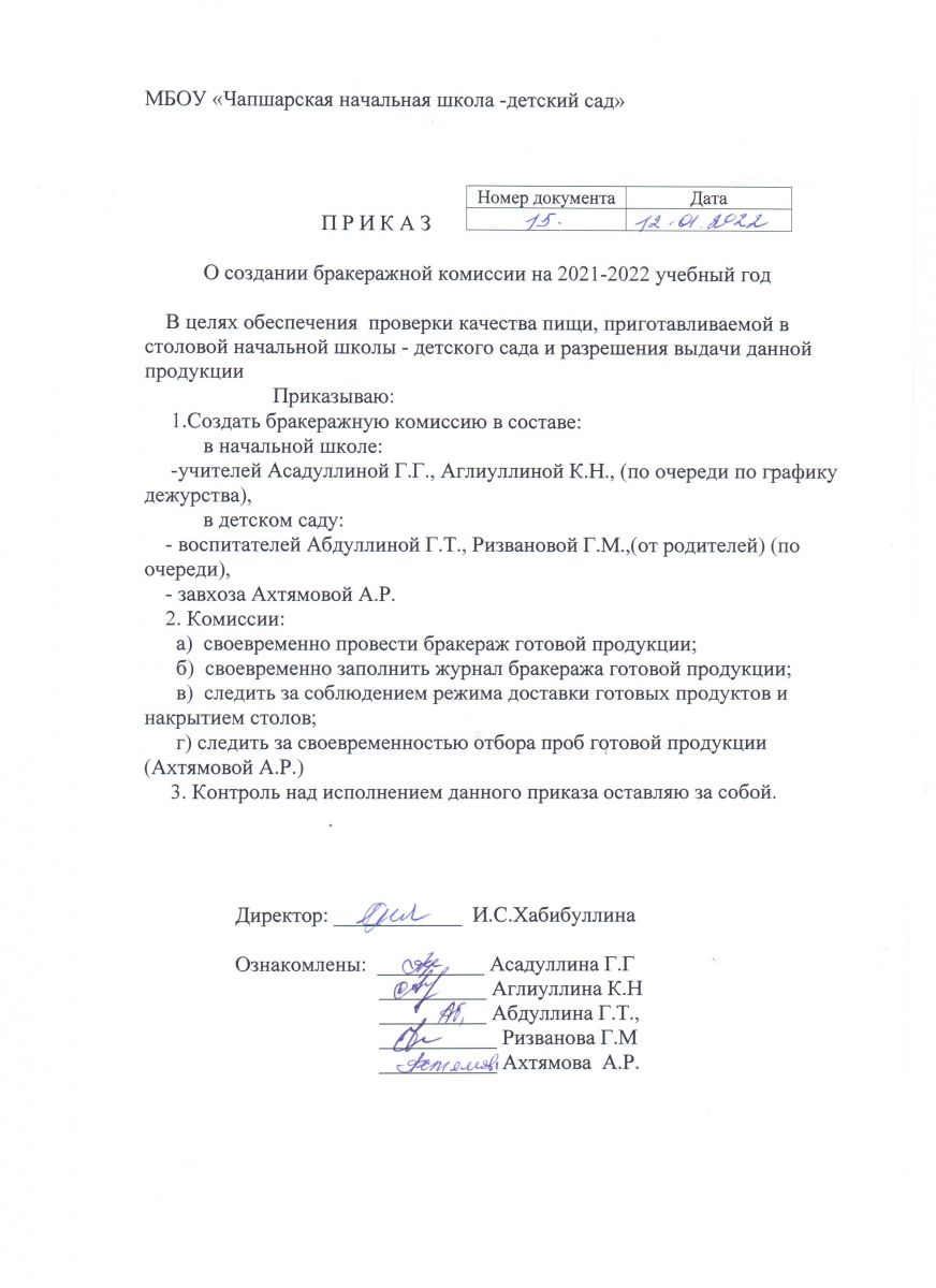 Приказ о создании бракеражной комиссии