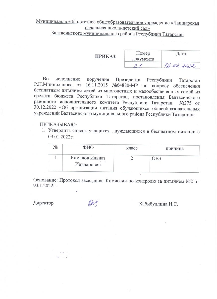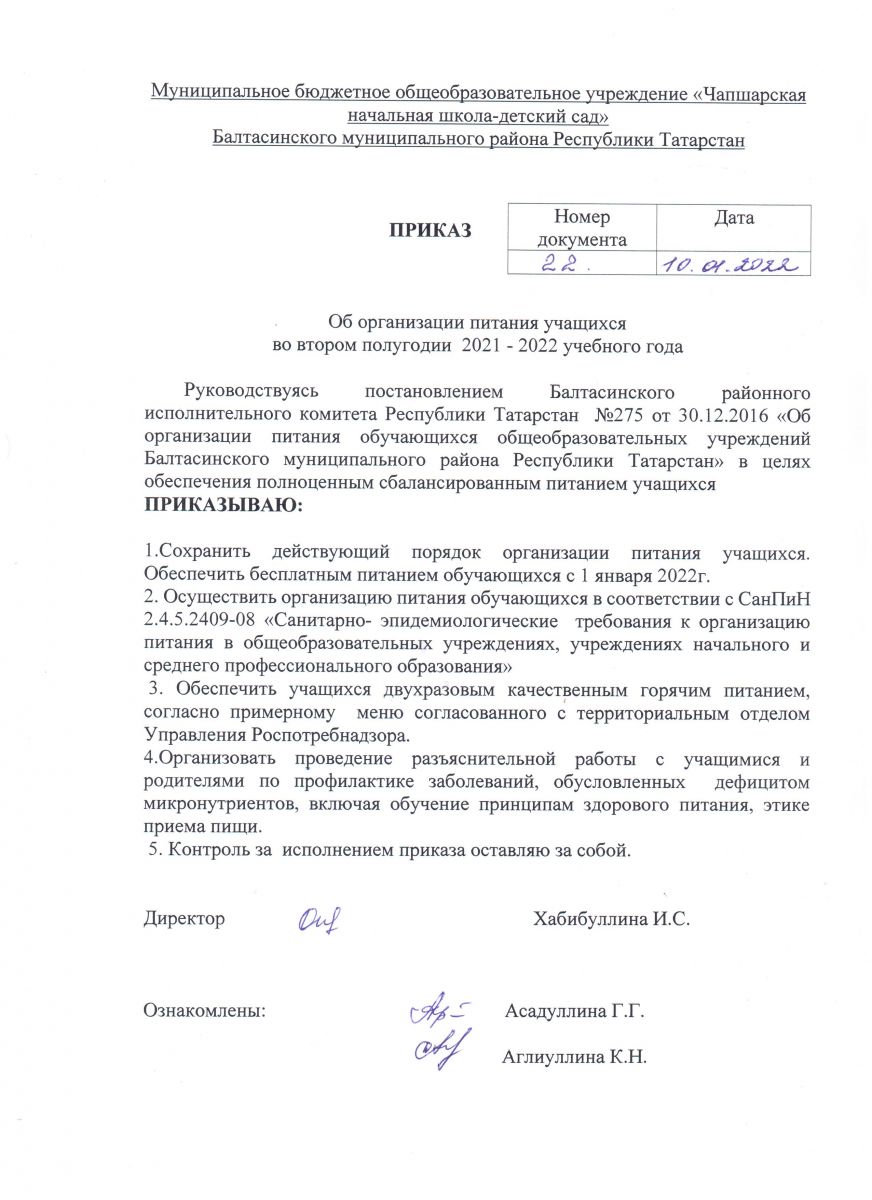 Приказ об организации питания учащихся