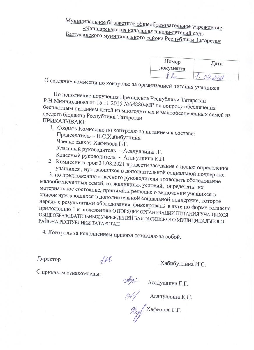 приказ о создании комиссии по контролю за организацией питания учащихся