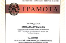 Обучающаяся 3 класса Камалова Суюмбика стала призёром в Всероссийском конкурсе детско- юношеского творчества по пожарной безопасности "Неопалимая купина". /3 нче сыйныф укучы Камалова Сөембикә янгын куркынычсызлыгы буенча Бөтенроссия балалар - яшүсмерләр иҗаты конкурсында призёр булды һәм грамота белән кыйммәтле бүләккә ия булды. Әфәрин, сеңлем!