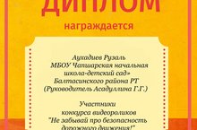 Награждается Аухадиев Рузаль за активное участие в республиканском конкурсе видеороликов "Не забывай про безопасность дорожного движения!"