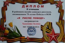 На районном конкурсе рисунков "Я рисую победу" обучающаяся 2 класса Хакимова Залина заняла 2 место.