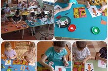 Балалар кисеп ябыштыру шөгылендә икегә бөкләнгән кәгазьдән кеше фигурасы ,геометрик фигуралардан курчакка кием кисү күнекмәләрен үзләштерделәр.