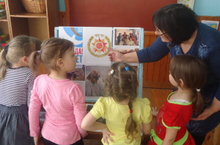 Уртанчылар төркеме балалары яраткан тәрбиячеләре Әлфия Гилван кызы белән бергәләп Бөек Җиңунең 70 еллыгына багышлап ясаган альбомнарны карадылар. Тәрбиячеләре аларны сугыш чоры балаларының каһарманлыклары белән таныштырды, батырлык төшенчәсенең мәгънәсен аңлатты, ә альбомны карап бетергәч хикәя ярдәмендә балаларга бүгенге көн батырлыгы турында мәгълүмат бирде, сугыш чоры балаларына һәм бүгенге көн батырларына карата хөрмәт тхисләре уятты.