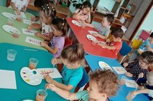 Закрепление технических навыков рисования красками (полностью опустить кисть в банку с водой, убрать излишки воды с кисти на край банки и т.д.).