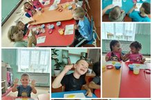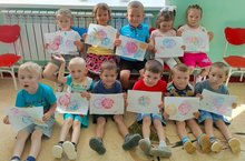 Дети младшей группы рисуют мыльными пузырями.