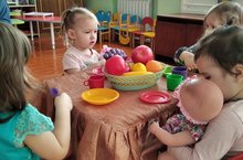 Кызлар үзләренең курчаклары белән чәй мәҗлесенә кунакка килделәр.