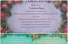 Воспитанники младшей группы награждены дипломами и сертификатами за участие в конкурсе-выставке елочных игрушек и звездочек./ Кечкенәләр төркеме балалары күргәзмә-бәйгедә катнашкан өчен дипломнар һәм сертификатлар белән бүләкләнделәр.
