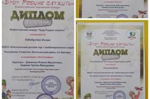 Мәктәпкә әзерлек төркемендә тәрбияләнүче Николаева Азалия, Хабибуллин Ислам, Плотников Динис Бөтенрәсәй "Буду Родине служить" конкурсында катнашып 1нче дәрәҗәдәге Дипломга лаек булдылар.