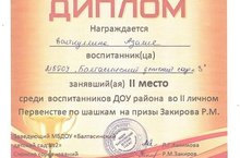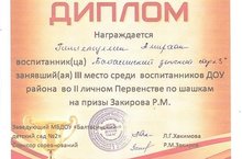 Воспитанник подготовительной группы Гиниятуллин Амирхан награжден дипломом за III место по шашкам на призы Р.М.Закирова среди воспитанников ДОУ района. Поздравляем!!! 14.04.2022