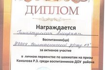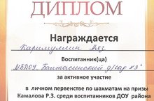 Воспитанник подготовительной группы Каримуллин Аяз награжден дипломом за участие в личном первенстве по шахматам на приз Камалова Р.З среди воспитанников ДОУ 20.04.2022