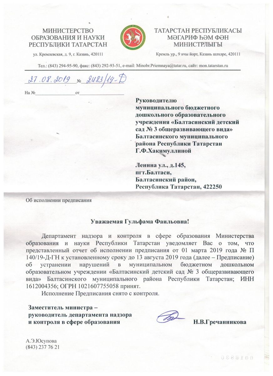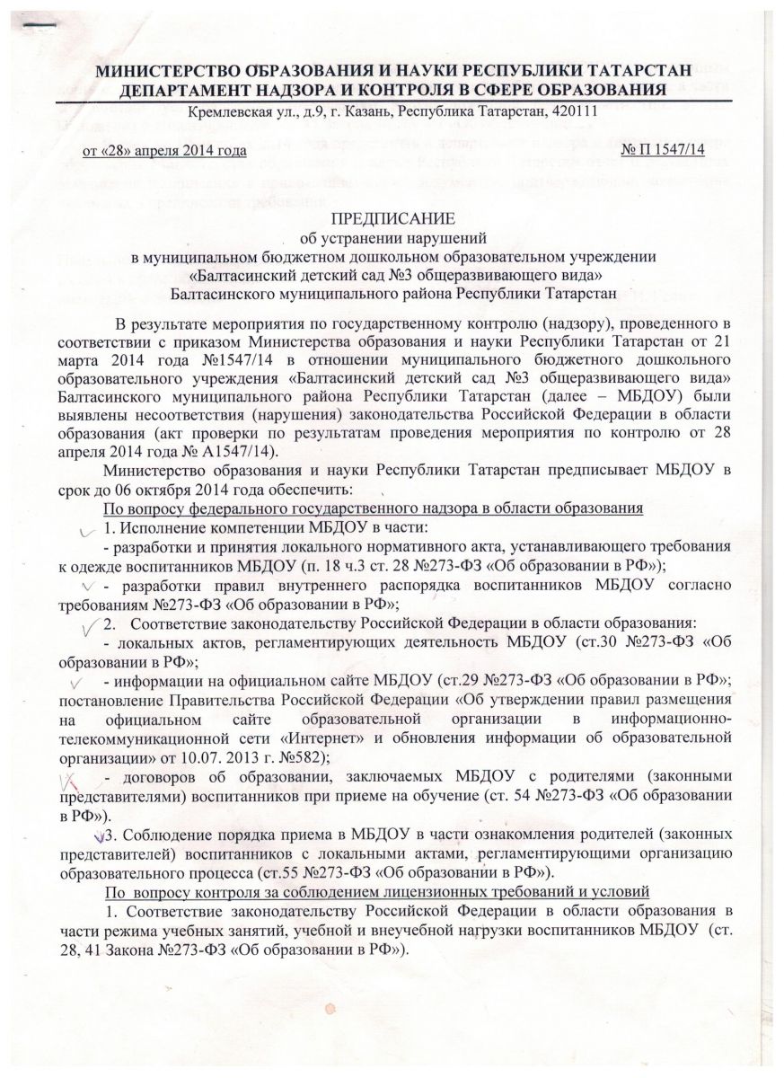 Отчёт об исполнении предписания департамента надзора и контроля в сфере образования МОиН РТ