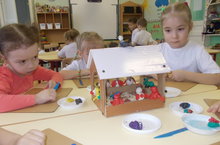 Уртанчылар төркемендә «Җимлектәге кошлар “ темасына әвәвләү шөгыле. Балалар бу шөгыльдә коллектив композиция эшләделәр , алар үзләренең эшләрен башкаларныкы белән чагыштырды, иң оста әвәләүчене билгеләп, нинди матур композиция килеп чыкканына сокландылар. Бер берсе белән ярыша ярыша үзләренең кошлар турындагы белемнәре белән уртаклаштылар. Шәгыльдән соң балалар саф һавага чыгып җимлеккә очып килгән кошларны икмәк валчыгы, көнбагыш, төрле җимнәр белән сыйладылар. Прогулка вакытында тәрбияче Рәзинә Камилевна балаларга кызыл түш, сары түш турында сөйләде.