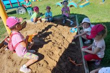 Комлык балаларның яраткан уен урыны булып кала. Куллары белән ком бөртекләренә кагылып, бала кул моторикасын үстерә, ә формаларга салып комның күләмен билгеләргә, күз үлчәмен үстерергә өйрәнә. Баланың иҗади сәләте, фантазиясе формалаша. Төрле замоклар төзеп, бала үз дөньясын булдыра шул ук вакытта эшләргә һәм максаларга ирешергә өйрәнә./Песочница по-прежнему излюбленное место детей. Торгая руками песчинки, дети развивает мелкую моторику рук, а определяя количество песка, которое нужно насыпать в формочки, развивает глазомер. Они развивают творческие способности ребёнка, будят его воображение. Строя песочные замки, дети создаёт собственный мир, выдумывает и фантазирует и в тоже время учится работать и добиваться цели.