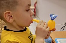 Сөйләм сулышына уен: “ Бер,ике,өч – оч!Логопед эшчэнлекләрендә, бала авазларны дорес итеп әйтсен өчен аны дөрес итеп суларга өйрәтергә кирәк.Сулыш гимнастикасы – организмның үз эшчәнлеген ныгыта. Шушы сулыш гимнастикасы(Аэровол) авазларны кую өчен кирәкле һәм мәгънәле шартларнын берсе санала.Фонемик ишетү һәм артикуляция моторикасы үсеше белән беррәттән , дөрес тавыш бирүне формалаштыруның әзерлек этабында башлана.Буген логопед эшчәнлегендә "Бер,ике, өч - оч!" уены аша, балалар түгәрәк шарны идәнгә төшермичә, сулышны дөрес итеп көйләп:кызурак, әкренерәк дип , сөйләм сулышын үстерелешен көйләргә өйрәнделәр./ Дыхательная гимнастика является хорошей профилактикой заболеваний органов дыхания, развивает несовершенную дыхательную систему ребенка, укрепляет защитные силы организма. Выработка воздушной струи(Аэробол) считается одним из необходимых и значимых условий постановки звуков. Работа по воспитанию воздушной струи (Аэробол) начинается на подготовительном этапе формирования правильного звукопроизношения, наряду с развитием фонематического слуха и артикуляционной моторики. Игра на развитие дыхания « Раз, два, три – лети!» Суть этого тренажера – игры заключается в том, чтобы не уронит шарик на пол, то есть ребенку необходимо научится контролировать поток своего воздуха, дуть: сильнее, слабее, продолжительно, коротко. Именно такая система позволяет научить ребенка контролировать речевое дыхание.