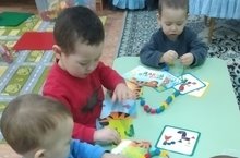 Икенче кече яшьтәгеләр төркемендә балалар мәрҗәннәрне төсләре буенча тезәргә өйрәнәләр. Һәр төсне чиратлаштырып бауга тезеп уйныйлар.Бу “Мәрҗәннәрне тез” дигән дидактик уен төсләрне белүне ныгыта, хәтерне үстерә, бармак чукларын үстерүгә ярдәм итә./В второй группе раннего возраста дети играют дидактическую игру “Собери бусинки”. Игра направлена на закрепление знания детей о цвете, форме бусинок. Формирует у детей устойчивое зрительное восприятия, развивает мелкую моторику рук. В ходе игры дети упражнялись вдевать на шнур бусинки. Им было весело интересно.