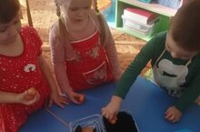 Кечкенәләр төркемендә балалар балчыкның үзлекләрен өйрәнделәр,уңдырышлы җиргә суган утырттылар./Дети младшей группы изучали свойства земли и посадили лук.