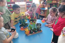 Уртанчылар төркемендә әти-әниләр ярдәме белән тәрәзә төбендә бакча булдырдык. Балалар үсентеләрне кызыксынып күзәтәләр, су сибәләр, тәрбиялиләр, тәҗрибәләр уздыралар. / В середней группе с помощью родителей сделали огород на подоконнике . Дети с интересом наблюдают за растениями, поливают, ухаживают, проводят опыты.