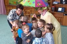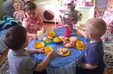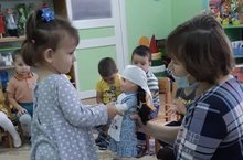 Нәниләрнең икенче төркемендә режим вакытларында "Гөлбикә" исемле курчак белән уеннар уйныйлар./Режимных моментах дети второй группы раннего возраста играют татарские народные игры.