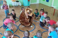 Уен эшчәнлектә балалар кунак аю белән хәрәкәтле уеннар уйнап күңел ачтылар. Уеннын максаты:бер -бер артлы йөрергә, һәм сигналны ишетеп чүгәләргә өйрәнү.