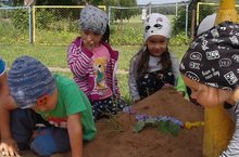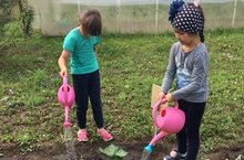 Балалар бакчасы тәҗрибә участогында кызу эш бара. Зурлар төркеме балалары яшелчәләргә су сибәләр, тутәлләрне йомшарталар һәм чүптән арындыралар, төрле тәҗрибәләр үткәрәләр.